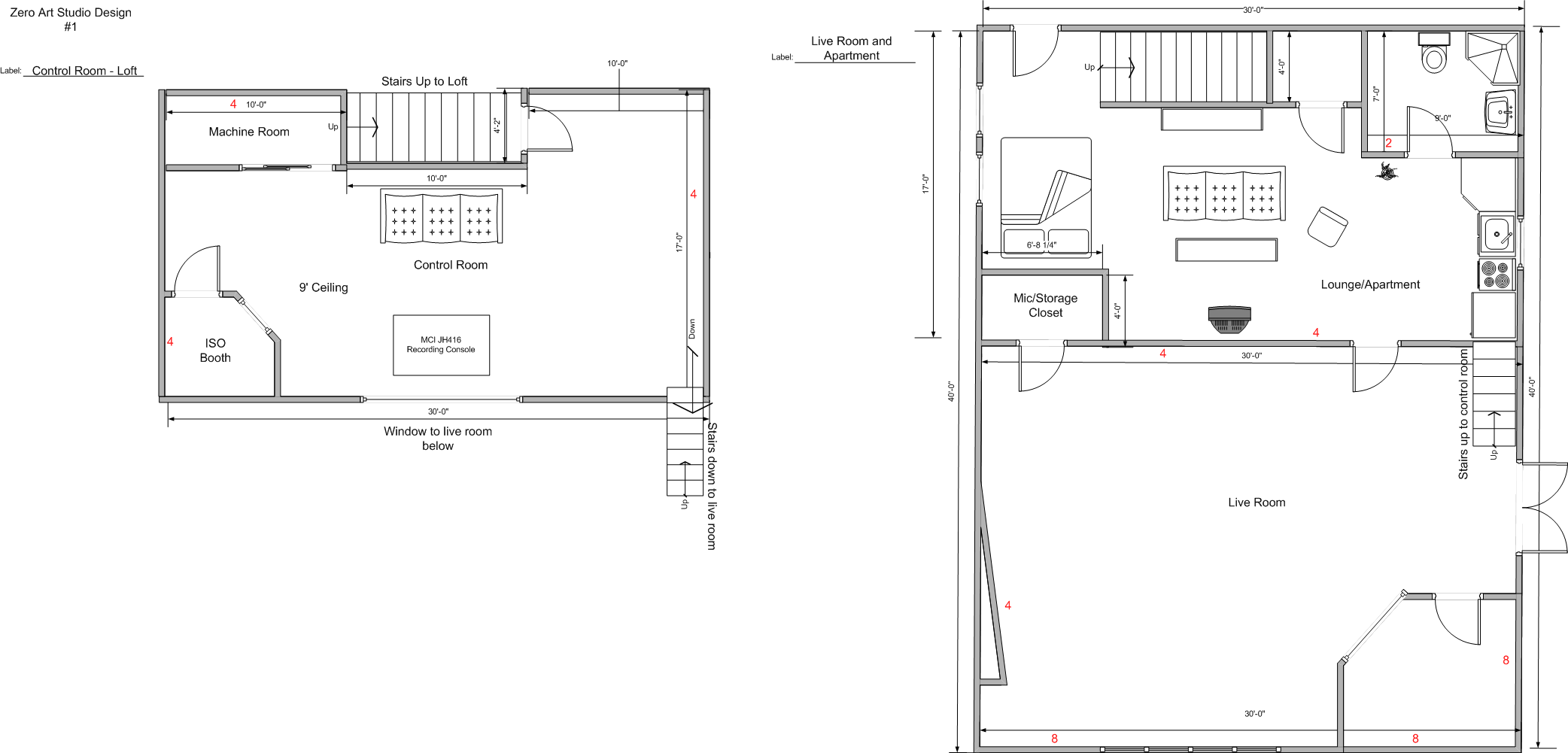 I believe Amy and I are really close to being able to start working on the new studio. I’ve gone through tons of iterations of the studio design and I’m ready to add another. this one has a loft space that would contain the control room, which would look out over the live room. a lounge/apartment would be downstairs below the control room/loft. What do you think?